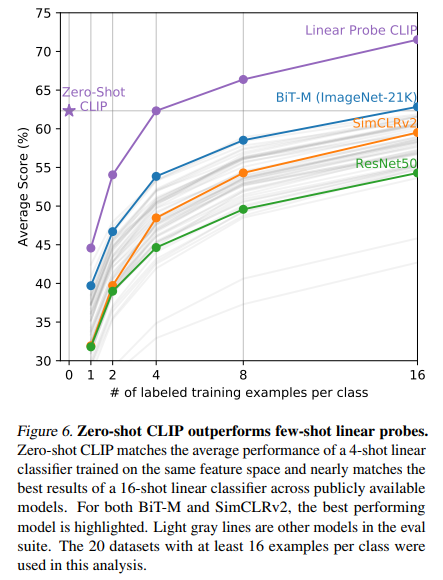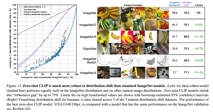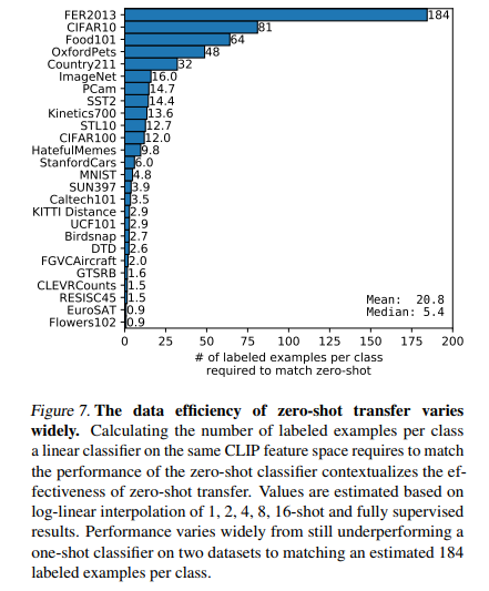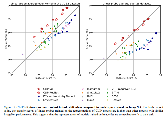 왼쪽 사진은 logistic regression classifier가 몇 개의 example을 학습하면 Zero-shot CLIP을 따라잡을 수 있을까를 나타낸 그림입니다. 오른쪽 사진의 linear probe 성능과 Zero-shot 성능을 비교한 사진입니다. y=x 그래프는 이상적인 Zero-shot classifier 성능을 나타낸 것인데요. 대부분의 데이터 셋에 대해서, 아직은 Zero-shot 성능이 fully-supervised classifiers보다 성능이 좋지 않게 나오는 것을 확인할 수 있습다.