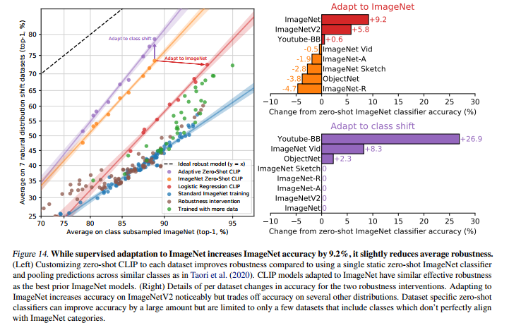 위 사진들은 trade-off들을 나타냈습니다. 왼쪽은 Robustness-Accuracy trade-off로 ImageNet data로 'adapt' 할수록 정확도는 높아지지만, robustness는 떨어지는 걸 확인할 수 있습니다. 오른쪽 사진도 비슷하게, shot이 늘어날수록 해당 task에 대한 성능은 높아지지만 모델의 generality가 감소하는 걸 볼 수 있네요.