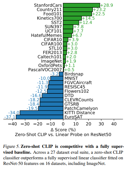 왼쪽은 Fully supervised, 오른쪽은 few-show methods와 Zero-shot CLIP을 비교한 그림입니다. 몇몇 데이터 셋에 대해서는, 아직 fully supervised method가 우세한데요. EuroSAT과 같이, fine grained detail을 잡아내는 능력이 필요한 데이터 셋에 대해서는 아직 성능이 부족한 것처럼 보입니다. few-shot methods 보다는 확실히 더 좋은 성능을 보이네요. 그래도 fully supervised methods와 Zero-shot CLIP의 성능이 비슷한 것이 굉장히 인상적입니다.