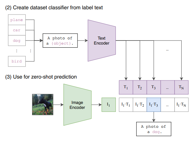 일반적으로 Image classification task의 class는 단일 라벨로 구성되어 있지만, CLIP의 text data는 짧은 문장으로 구성되어 있습니다. 단일 라벨의 경우, 충분한 semantic 정보를 포함하지 못 할 뿐만 아니라 다의성을 가질 문제도 존재하기 때문에 약간의 수정을 거쳐 text encoder에 삽입하게 됩니다. image encoder를 거쳐서 나온 feature는 text encoder의 결과들과 우유사도 계산을 하게 되고, 최종적으로 가장 유사도가 높은 클래스를 정답으로 반환하게 됩니다.