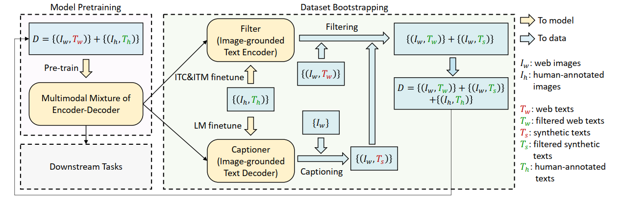 - 인간이 직접 제작한 {image, text} pair로 Filter(image-grounded Text Encoder) 학습하고, web에서 수집한 {image, text} pair, 그리고 Captioner로 생성한 {image, generated_text} pair를 각각 Filter에 통과시킵니다. 이 때, image, text가 서로 안 맞는 경우를 제거하는 방식으로 Noisy web data 문제를 해결했습니다.